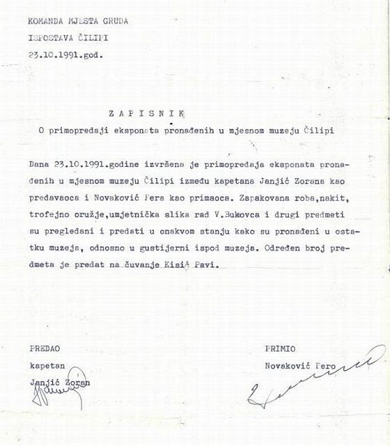 Nakon paleža Čilipa „oslobodioci“ juga Hrvatske uspjeli su doznati gdje su Konavljani „sakrili blago“. Poput mnoštva drugih stvari, primjerice, opreme iz Zračne luke Dubrovnik, pod firmom „ratnog plijena“ htjeli su to blago odvesti preko Debelog brijega u Crnu Goru. Tim zamislima, unatoč agresorskom okruženju, suprostavili su se mještani Čilipa Pero Novaković i Ivo Kravić koji je, stjecajem okolnosti, od prije rata poznavao jednog od visokorangiranih oficira JNA iz „Komande mjesta Gruda“. Uspio ga je uvjeriti kako je riječ o tradicijskom blagu, i 23. listopada obavljena je „primopredaja eksponata pronađenih u mjesnom muzeju Čilipi“. Muzejski eksponati su zatim prevezeni u Cavtat gdje su u zgradi tamošnjeg mjesnog odbora pohranjeni dočekali oslobođenje Konavala u listopadu 1992. godine.