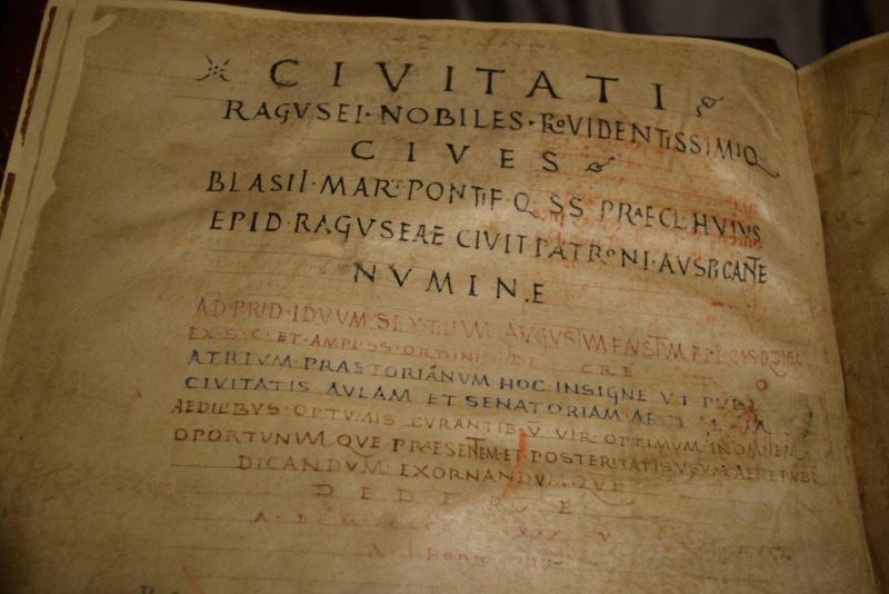 U palači Sponza predstavljen je Statut Grada Dubrovnika, nastao 1437., koji je prepisani i dopunjeni primjerak iz 1272. godine - Na 127 pergamenskih listova ispisan je tekst tintom na bazi željeza te ukrašen inicijalima - Statut je uvezan u drvene korice presvučene kožom, a knjiga je ukrašena metalnim dekoracijama na prednjoj i stražnjoj strani - Na petoj stranici nalazi se iluminacija koja prikazuje sv Vlaha, zaštitnika Grada Dubrovnika.
