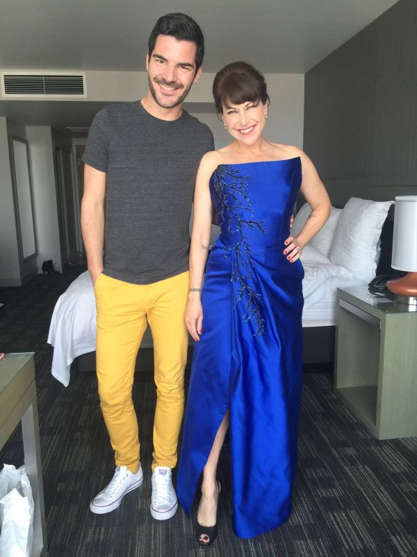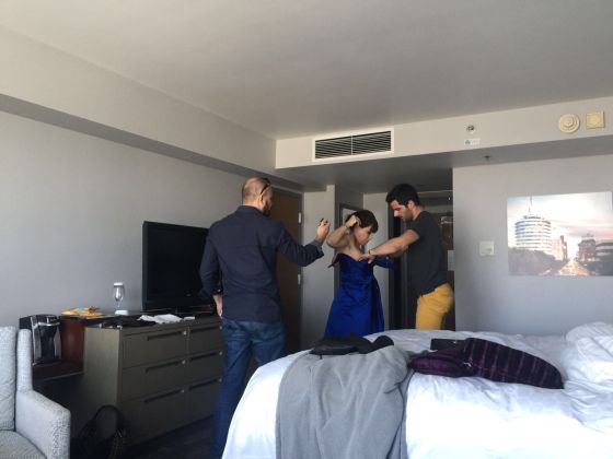 Pronašao je svilenu kraljevsko plavu tkaninu prave nijanse i krenuo pomalo, bez kroja, samo s potpuno jasnom vizijom, kreirati za Sandy. Proba je bila dva dana prije dodjele.