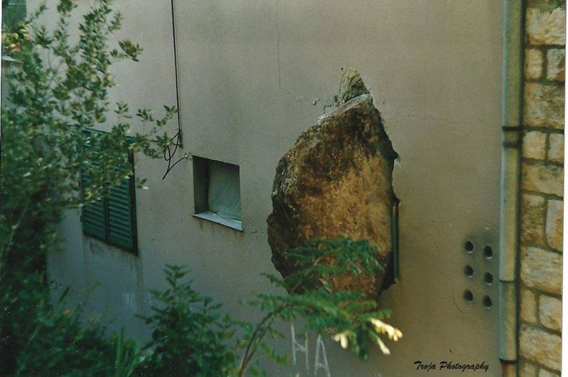 6.9. ujutro smo tek vidjeli rezultate razornog potresa, apsolutno svaka kuća je imala neko oštećenje, neke kao da nikad nisu ni postojale, kamenja, kupa, prozora, namještaja, svega je bilo po ulicama…Stijene s obližnjih